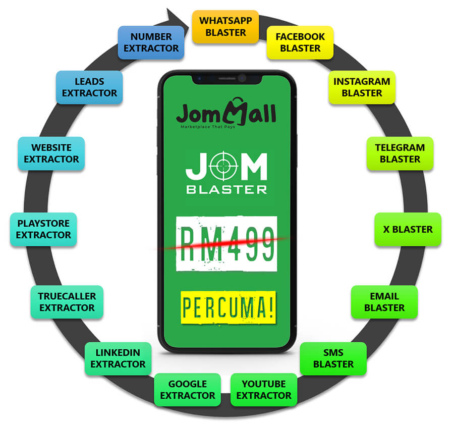 Dan tambahan Aplikasi Robot JomBlaster 15 Dalam 1 bernilai RM499 diberikan kepada anda secara PERCUMA! Aplikasi ini memudahkan anda mendapatkan prospek, meningkatkan peluang jualan, dan mempercepatkan perkembangan perniagaan.